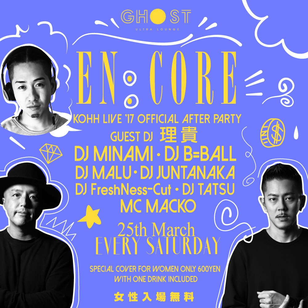 今や押しも押されもせぬ関西、大阪を代表するBIG PARTYに成長した毎週土曜日のGHOST看板パーティ「エンコア」!毎週600人オーバーの集客を誇り、大阪のクラブシーンを最先端へ引っ張って来たDJ MINAMI, DJ B=BALLをはじめとするDJ陣とともに上質な音楽とHOTな話題を提供する。常に進化し続ける"EN:CORE"を一度体感したら虜になること間違いなし!