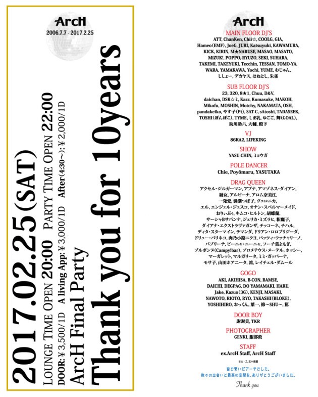 ArcHが営業スタートして10年。完全閉店となる最後の一夜に、ArcHを愛した多くのキャストが勢ぞろい!