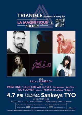 ジャンルにとらわれず、GOOD MUSICをお届けするトライアングル。 第3回目は5月に仏・ランスで開催されるフェスティバル、マニフィック・ソサイエティのキックオフパーティー。パリ出身人気プロデューサーのPara one、Kohhの“PARIS”のREMIXを手掛けたSam TibaとCanblasterがClub Chevalとして、また今大注目のヒップホップクルーkiLLaがフェスティバル出演に先駆けて登場!
