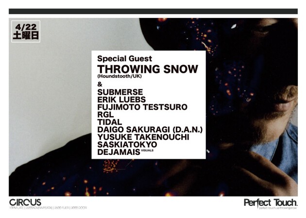 Throwing Snowは、Bonobo, Atoms for Peace等のツアーのサポートアクトや世界中で注目されているイギリスのクラブFabricが営業しているレーベルであるHoundstoothのアーティストの一人である。2年半ぶりの来日となる今回は最新のフルアルバム「Embers」のリリース記念として、大阪のレーベル・イベントPerfect Touchの共同主催のもと、4月21日(金)Circus Osaka、4日22日(土)Circus Tokyoの2都市で開催。