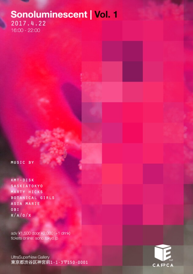 “Sonoluminescent” means “illuminated by sound”. This is the first event curated by NYC-based SONO in collaboration with CAPCA, and features 7 independent Tokyo artists.