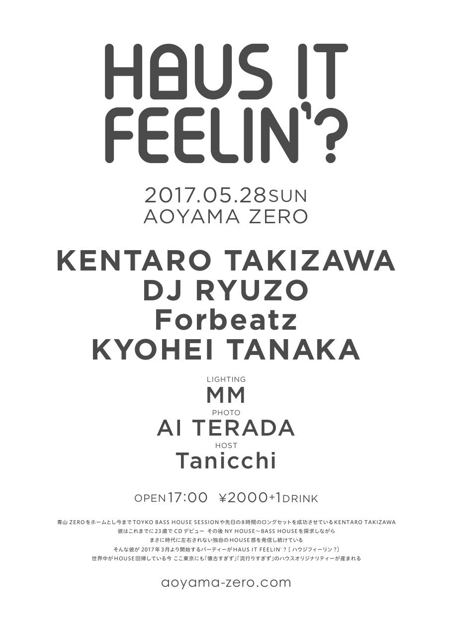 青山ZEROをホームとし独自のHOUSE感を提唱し続けているKENTARO TAKIZAWA。そんな彼のホームパーティーがHaus it Feelin' ?だ。今年3月にスタートしたこのパーティーは、時代に左右されない独自のHOUSE感を発信し、「懐古すぎず」、「流行りすぎず」のハウスオリジナリティーが産まれたことを証明した。今回で2回目を迎える今パーティー、ぜひ体感してみてはいかがだろうか??