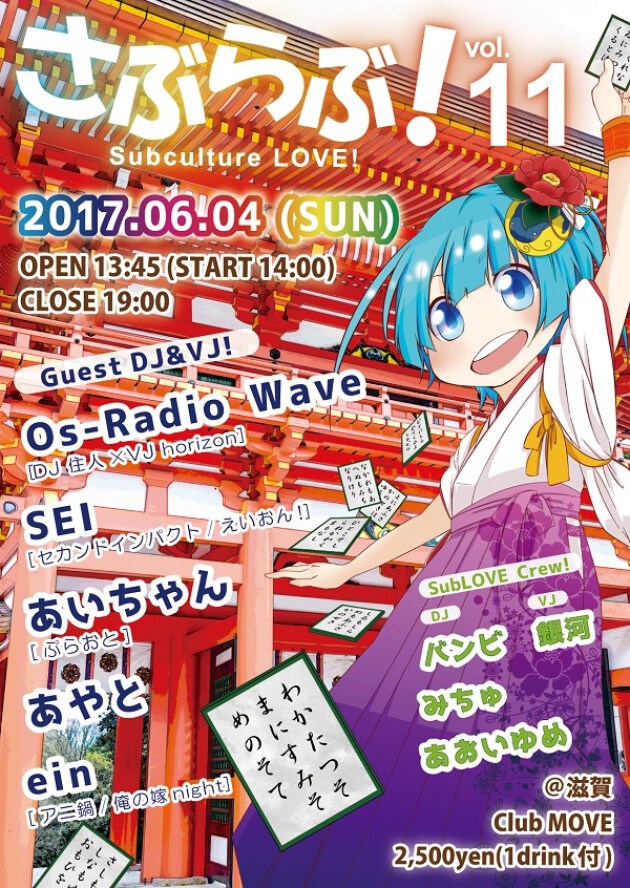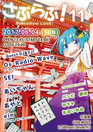 三年目を驀進する滋賀発のアニソンクラブイベント「さぶらぶ!」!今回もバラエティー豊富な豪華大物ゲストを始めとするDJVJ陣がアニソンやゲームソング、ボカロ曲などを中心に次から次へと曲を繋いでいきます!好きな曲で盛り上がるもよし、BGMにして語り合うもよし、もちろんクラブなノリで昼間からお酒を飲むもよし!せっかくの休日、ヲタク活動を充実しちゃいましょう!