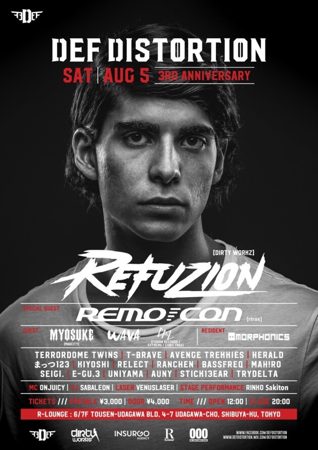 今回の3RD ANNIVERSARYは世界のHardstyleシーン第一線で活躍するアーティストであり、YouTubeで再生回数120万回を突破した名曲【Without You】をはじめとする数々の名曲を手がけてきた大手HardstyleレーベルDirty Workz所属の若き天才アーティストRefuzionが来日出演決定!
