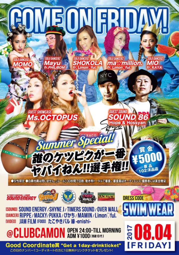【COME ON FRIDAY!】8/4(金)☆毎月第1金曜開催『カモフラ』★★誰のケツピクが一番ヤバイねん!!選手権!!☆☆NEW GENERATIONソロ回し&ベテランSHOWCASE★★DRESS CODEはSWIM WEAR☆☆Good Coordinate賞としてこの日のNo.1コーディネートの方は朝まで飲み放題★★