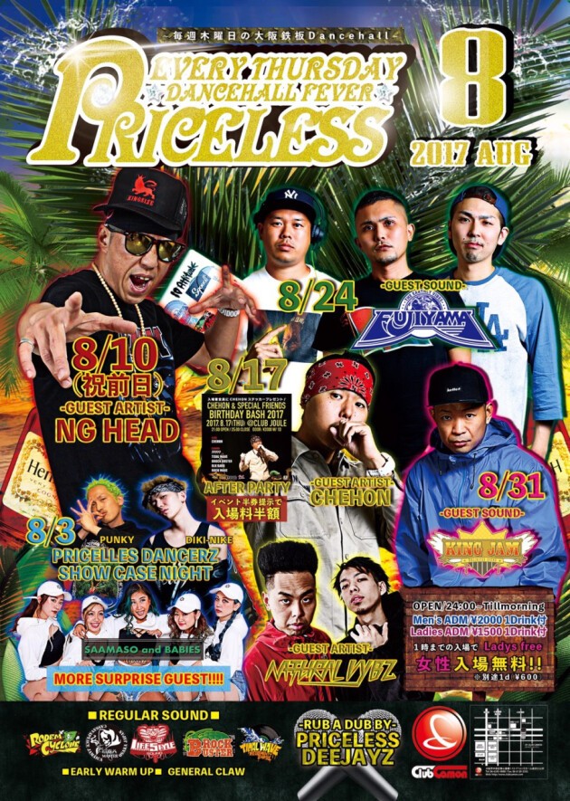 【毎週木曜PRICELESS】8/17(木)☆EVERY THURSDAY DANCEHALL FEVER『PRICELESS』☆☆毎週木曜日の大阪鉄板DANCEHALL★★CHEHON BIRTHDAY BASH AFTER PARTY☆☆GUEST ARTISTにCHEHON、東京からHUMAN BEATBOX BAND、NATURAL VYBZが登場★★