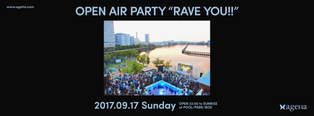 9/17(日)に開催を予定しておりました「OPEN AIR PARTY “RAVE YOU!!”」は、台風18号の影響により、中止とさせていただくことになりました。