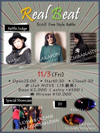 立命館大学ストリートダンスサークル『R.D.C.』がオーガナイズするダンスバトルイベント。FREEで踊れるDANCERを目指そうという目的から始まったREAL BEATも今回で33回目。今回のバトルコンテンツは3on3フリースタイルバトル!今までにないバトルが期待できる!BREAK BEAT,HIPHOP,FUNKを中心とする幅広いジャンルがPLAYされます!