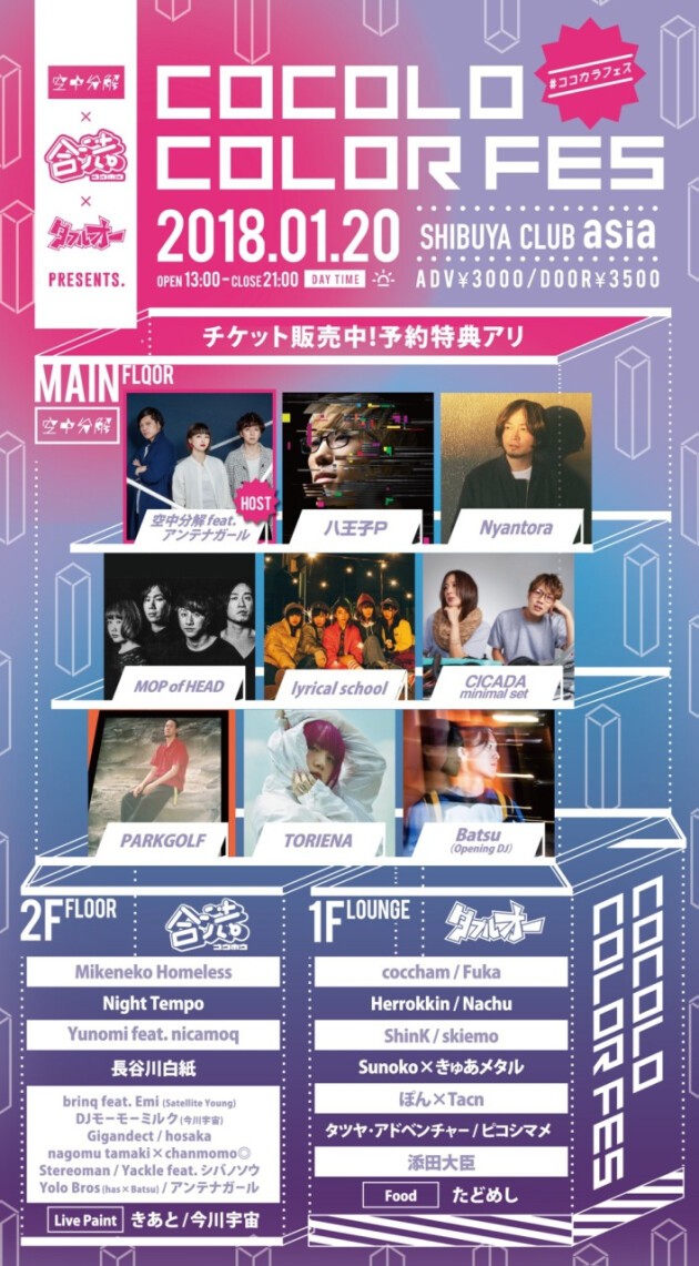 歌心溢れるアーティストにフィーチャーした空中分解企画の"COCOLO COLOR"。これまで渋谷Gladなどで開催してきましたが、今回15回目の開催を記念して、"COCOLO COLOR FES"と題し、大阪を中心としたイベント「合法」と、名古屋を中心としたイベント「00"ダブルオー"」とコラボし、渋谷asiaにて3フロアで開催。ライブハウスとクラブのポップカルチャーを融合した1日限りのスペシャルイベント。