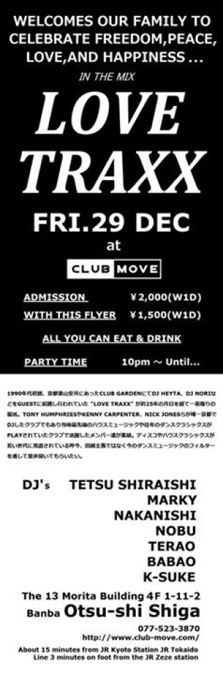 1990年代初頭、京都東山安井にあったCLUB GARDENにてDJ HEYTA、DJ NORIなどをGUESTに招聘し行われていた "LOVE TRAXX" が約25年の月日を経て一夜限りの復活。