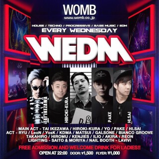 WOMB + WEDNESDAY + ELECTRONIC DANCE MUSIC から名付けられたネーミング WEDM!!! BIG ROOM、BOUNCE、FUTURE HOUSE、TRAP、DUBSTEP、TWERK など ELECTRONIC DANCE MUSIC を網羅し、自由自在に MASHUP させる。WEDM のレジデントは、世界一有名なエレクトロニックミュージックレーベルとして名高い Ministry of Sound のレジデントに抜擢された経験を持つ TAI IKEZAWA、F.FACTORY JAPAN DJ PRODUCT TEAM 代表として数々のパーティーをプロデュースしてきた HIROKI-KURA、HIP HOP / R&B を中心としたプレイやスクラッチや2枚使いなどのトリックプレイも得意とする DJ YO など豪華アーティストが務め、フェス好きの耳の肥えたクラウドをも平日から盛り上がりの渦に巻き込んでいる。