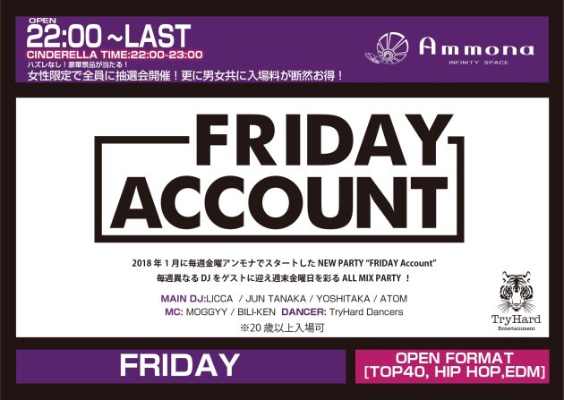 2018年1月に毎週金曜アンモナでスタートしたNEW PARTY “FRIDAY Account”