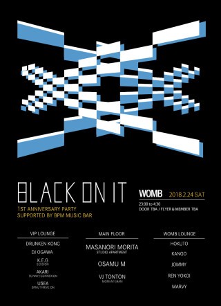 日本が世界に誇るダンスミュージックユニット STUDIO APARTMENT の MASANORI MORITA と、OUTERSPACE RECORDS 主宰し、日本のアンダーグラウンドシーンには欠かせない存在となった OSAMU M の2人がレジデント DJ をつとめ、毎回旬なゲストを迎え開催している。その BLACK ON IT が道玄坂を飛び出し、1周年を WOMB にて開催決定。