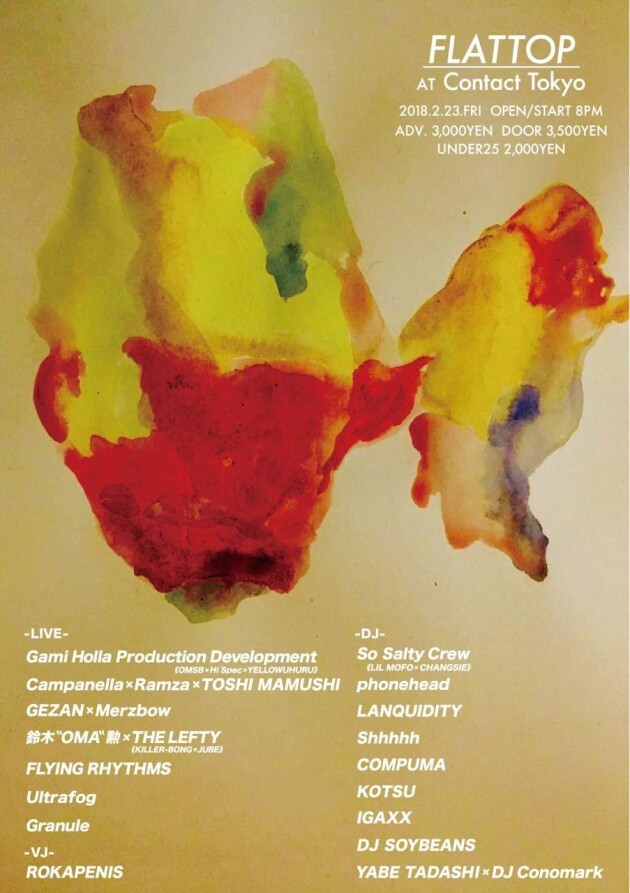アヴァン・エレクトロニクス~ノイズ・サウンドの消失点に見えるはヒップホップのビートと言葉、そして傍にはジャズとテクノのグルーヴが体を揺らす。シームレスに混在する、余白のない濃厚なる音の連鎖をつきつけるパーティ、FLATTOP。OMSBらが新たな表現の場として立ち上げたレーベル/アーティスト集団、Gami Holla Production Development (OMSB×Hi’Spec×YELLOWUHURU)、そして名古屋からはCampanella、さらには彼とコラボーレーターとして幾度も邂逅しているRamza、TOSHI MAMUSHIがライヴを披露。レジェンダリーなジャズ・ベーシスト、鈴木 “OMA”勲とBLACK SMOKER軍団の2つの脳、THE LEFTY (KILLER-BONG+JUBE)によるトライアングル、とFLYING RHYTHMSのもうひとつのトライアングルが連なる。さらにGEZAN x MERZBOWのサウンドが覆い尽くす。叩き上げの実力派2人が手を結んだSo Salty Crew (LIL’ MOFO&CHANGSIE)、さらにはUltrafog、Granuleのライヴも。Contactでも、黒煙のようなグルーヴを紡ぎ出す、YABE TADASHI & DJ Conomarkのタッグをはじめ、COMPUMA、Shhhhhなど、東京の夜の最深部がのぞき見えるはず。その境界線は魅惑的に飛散するのだ。