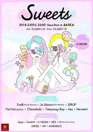 当日は、パティシエ兼DJのU NGSMによるスイーツも振舞われ、イベント名にふさわしい様々なスイーツ。お酒と音楽を楽しめる一夜になるであろう。