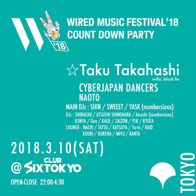 会場には、全国5箇所(東京SIX、大阪Giraffe、京都Kitsune、名古屋ORCA、静岡CLUB 51)にて開催決定! 全イベントにはWIRED MUSIC FESTIVAL唯一のレジデントDJであるNAOTOが各都市を盛り上げる! そして東京のカウントダウンPARTYには、「Supported by block.fm」として、☆Taku Takahashiがヘッドライナーとして華を添える。