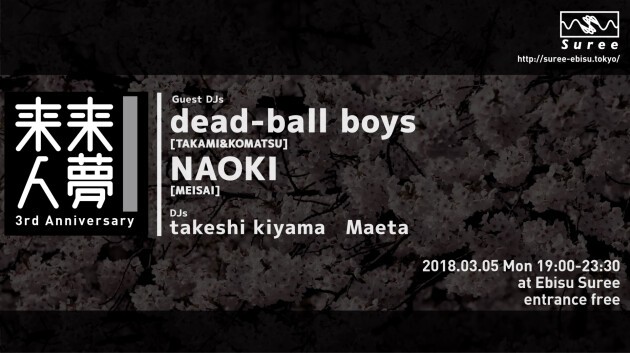 月頭の月曜からテクノやハウスなどを聴きながら3周年! Special Guest DJとして 3/10に20週年を迎えるREBOOT@CONTACTより TAKAMI&KOMATSUのB2Bユニット"dead-ball boys" そして迷彩からNAOKIのDJset!!
