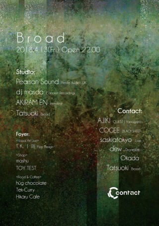 そんな彼をサポートするのはベルリンを拠点に活動し、最先端なサウンドを提供し続けるCabaretのdj masda。昨年末にはFuture Terrorにも出演する等、独自グルーヴで活躍の場を広げているAKIRAM ENが参戦。Pearson好きな2人がどんなアプローチを仕掛けてくるか目が離せない。一方Contactフロアには山形で野外パーティQUESTを主宰するAJIKIやBLACKSHEEP主宰のCOGEEも参戦。Broad特有の多彩なシーンが交差するスペシャルな一夜を、心ゆくまで体感してほしい。