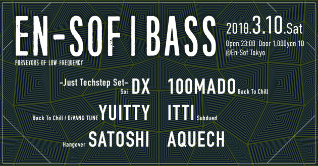 En-Sof Tokyoから発信するBass Music イベント、EN-SOF | BASS。個性豊かなDJを迎えて、Drum and Bass/Dubstepサウンドを軸にドープな一夜を演出する。