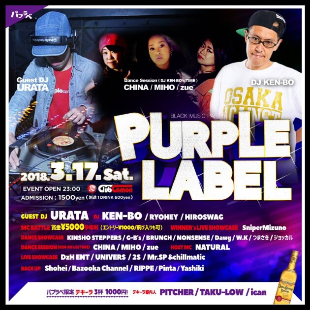 【PURPLE LABEL】3/17(土)☆奇数月第3土曜開催『PURPLE LABEL』★★賞金5,000円争奪MC BATTLE開催(飛び入り可)☆☆パプラベならではのハイクオリティーなアーティストやダンサー多数出演★★
