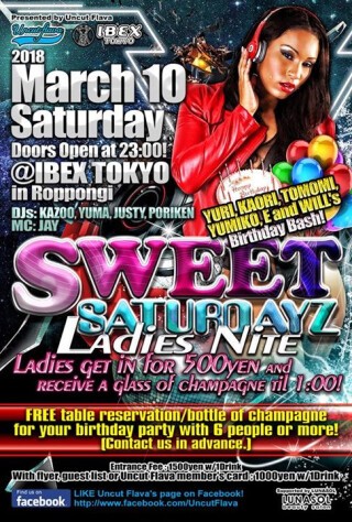 >>> 3/10(土) SWEET SATURDAYZ "LADIES NITE" @ IBEX TOKYO(六本木) >> Yuri、Kaori、Tomomi、Yumiko、E、Willのバースデーパーティー