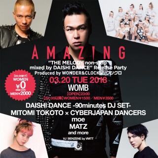 PKCZ®よりDJ MAKIDAIとDJ DARUMAを招いた2月に続き、ビッグパーティ「AMAZING」の次なる開催が決定した。今回は、3/21(水)に最新ミックスCD「THE MELODY」をリリースするDAISHI DANCEとコラボレーション。ノスタルジックかつ泣ける楽曲で構成された同作のリリースパーティも兼ね、MITOMI TOKOTOとCYBERJAPAN DANCERS、そしてmoeやMATZなども出演する。さらにこの日は、特別な演出を企画中。普段とは異なるWOMB空間のなかエキサイティングなピークタイムを次々と演出し、多くのクラウドたちを天高く舞い上がらせる!