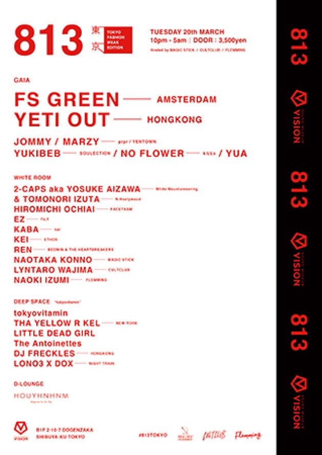 今年1月、Paris Fashion weekにて開催され、大盛況に終わったソーシャルパーティー”813”が”813 – Tokyo Fashion Week Edition -“と題し、SOUND MUSEUM VISIONとMAGIC STICK,CULT CLUB,FLEMMINGが