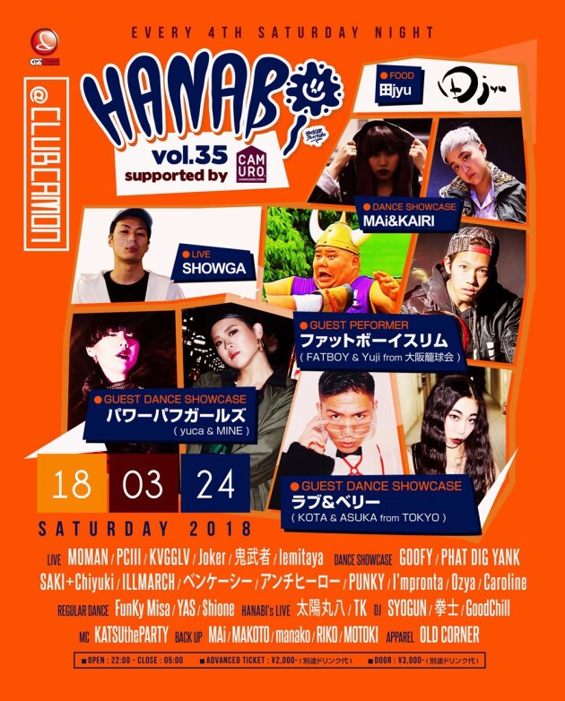 【HANABI vol.35】3/24(土)☆衣食音をコンセプトとする毎月第4土曜開催『HANABI』★★GUEST DANCERにラブ&ベリー(KOTA&ASUKA) from TOKYO、パワーパフガールズ(yuca&MINE)、GUEST PEFORMERにファットボーイスリム from 大阪籠球会が登場☆☆さらに各方面の多才な花火師達が多数出演★★