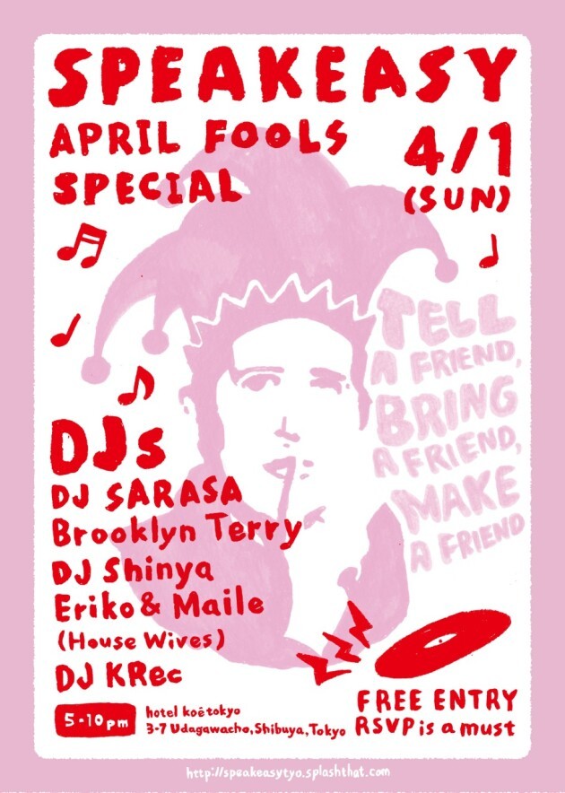 Speakeasyは細分化された今のナイトシーンに一石を投じる、国際都市東京ならではの試みとして4年前に始まり、東京の「リアル」なアーティスト、クリエイター、起業家、旅人、自由人が定期的に息抜きと情報交換をしに集結するDJ EVENT!業種、趣味、国籍、年齢、性別、音楽ジャンルといった社会の線引きにより、今まで遊び場が交わる事の無かった人々に呼びかけるイベントで、大人から子供まで楽しめます。