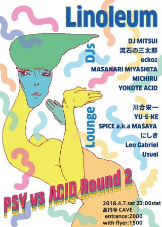 第1ラウンドから激しい打ち合いとなったリノリウム、サイケvs アシッドテクノ!!第2ラウンドはサイケサイドにはウーム等で活躍するDJ MITSUI 、アシッドサイドにはMASS やFLIP でレジデントを務めるYOKOTE ACID が参戦で前回以上の混戦を極めること間違い無し。テクノもハウスもトランス状態(@_@)