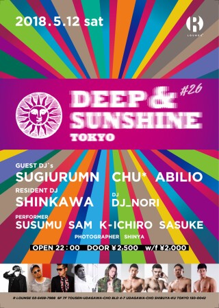 人気パーティDEEP&SUNSHINE TOKYO 26回目を迎える今回はGUEST DJにSUGIURUMN, CHU* / ABILIOをフィーチャー! 7Fには昨年11月にもD&Sとコラボレーションして大盛況だったNEXTを開催!!