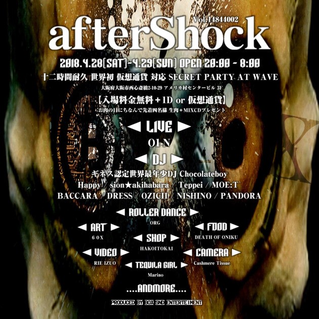 afterShock Vol.14844002 2018.4.28[SAT]-4.29[SUN] OPEN 20:00-8:00 【入場料金無料+1D or 仮想通貨】(再入場3000円) お肉の日にちなんで先着四名様 生肉+MIXCDプレゼント http://bit.ly/2v