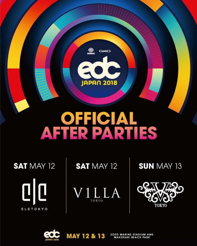 世界DJランキング2年連続1位のMartin Garrix をはじめ、Steve Aoki 、Diplo 、Above&Beyond、Deadmau5、Dimitri Vegas&Like Mike 、W&W、Alan Waker 、Alison Wonderland、Flosstradamus といった世界のトップアーティストが総勢40組以上集結する「EDC Japan 2018」のオフィシャルアフターパーティーを、同日21時よりV2 TOKYO / ELE TOKYO / VILLA TOKYO 3店舗にて開催する事が決定しました。