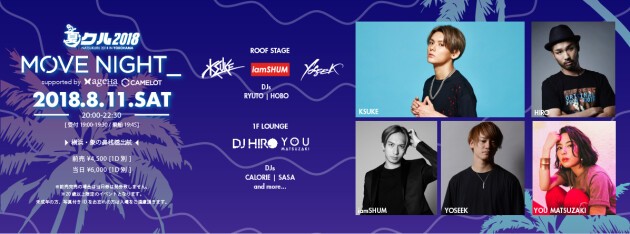 2018/8/11(土) MOVE NIGHT_ [出航時間] 出航20:00 帰航22:30 (受付19:00~19:30 / 乗船19:45) [ROOF STAGE] KSUKE / iamSHUM / YOSEEK (CAMELOT) / RYUTO / HOBO