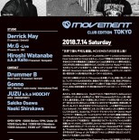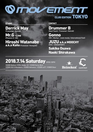 あれから、15年。現在Derrick Mayはデトロイトで毎年行われているMovementには関わっていないが、その間もずっと ー東京でMovementをやりたいー と言い続けてきた。震災直後に、日本への渡航に対してネガティブな空気が漂っていた中、彼が一切ためらわずに来日したことを覚えているだろうか?彼は東京に特別な想いを持っている。そして、自らが名前をつけたContactにも・・・。この場所でMovement Club Editionが、ついに実現することを、心して受け止めたい。きっと最高のパーティにしてくれるはずだ。 Studioでは、デトロイト・テクノのイノヴェイターDerrick Mayがヘッドライナーを務める。エモーショナルなテクノでダンスフロアに歓喜の祝祭をもたらしてくれるだろう。そして、Transmat系デトロイト・テクノファンから熱くサポートされているMr.Gがライブを披露する!前回の来日でのプレイもコアなファンたちの間で話題になっていたので、これは注目だ。Derrick Mayが主宰するレーベル"Transmat"の歴史上初めての日本人アーティストとなった、Hiroshi Watanabeがサポートを務める。「Threshhold of Eternity」は海外の音楽ジャーナリストから、ーDerrick Mayによる不朽の名作「Strings of Life」を超えるアンセム!ー と評価されるほどだったので、彼のプレイも見逃すことはできない!