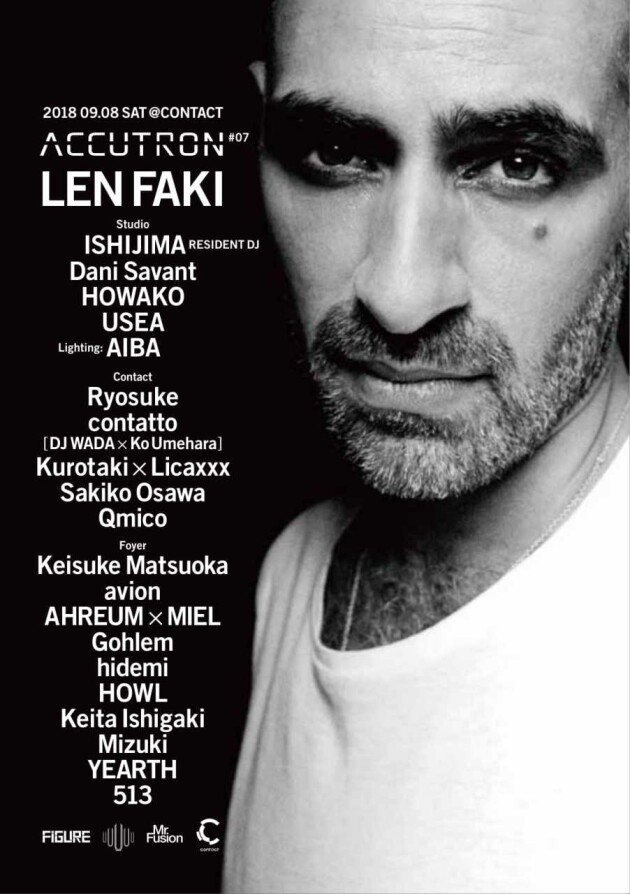 With over 15 years of experience in the forefront of the techno scene, DJ/Producer and label owner of Figure, Len Faki makes his way back to Japan. With ACCUTRON’s resident DJ ISHIJIMA, MIND OFF’s Dani Savant, and SPECTRA’s own HOWAKO supports the headliner. In the Contact floor, the local veterans DJ WADA and Ko Umehara takes the decks as their unit contatto. Setsuya Kurotaki will be playing back to back with Licaxxx, along with many other local talents.