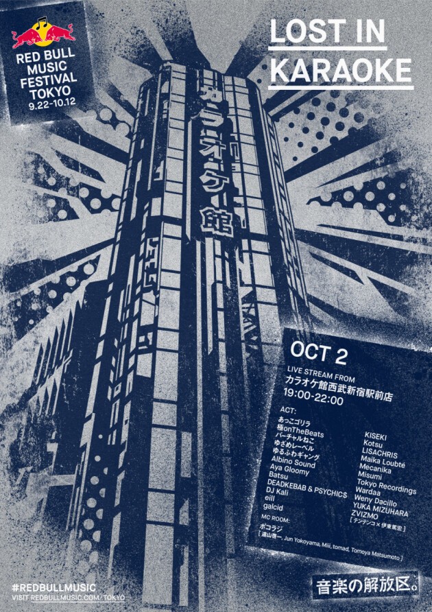 日本独特の文化=カラオケボックスを丸ごとジャックして、各部屋から気鋭アーティストのパフォーマンスをライブストリーミング配信するRed Bull Musicの人気コンテンツ「Lost in Karaoke」がカムバック! 今回は新宿・歌舞伎町のド真ん中にある「カラオケ館 西武新宿駅前店」の7つの部屋にDJ & LIVE機材、サウンドシステムなどを持ち込み、日本の音楽シーンの未来を担う若手アーティストたちのユニークかつ独創的なパフォーマンス&トークをお届けします。万華鏡のように飛び交う波形、催眠効果のあるリズム、ときには迫力のある歌声で、通常のカラオケボックスという空間の概念を取り払います。
