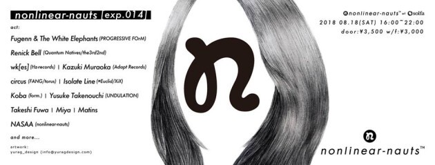 nonlinear-nauts [exp.014]となる今回は、YMOのカバーアルバム『YMO REWAKE』『坂本龍一トリビュート』『ジョビン・トリビュート』への楽曲提供や、Sonar Sound Tokyo等のビックイベントへの出演、国内外のTVCM/TV番組/WebBGM等の楽曲を担当するなどマルチな音楽家として活動しているShuji Saitoによるプロジェクト《Fugenn & The White Elephants》のライブプレイはもちろん、昨年夏に独ベルリンで開催された電子音楽の祭典Berlin Atonal 2017への出演を果たし益々注目を浴びている《Renick Bell》、 世界的に注目を浴びている東京を拠点とする電子音楽レーベルHz-recodsを主催する《wk[es]》、厳選されたトラックで編成されるDJに定評があるtorus主宰の《circus》、六本木アートナイトの期間中に行われたDE/construct: Updating Modernismにも出演するなど尖端音楽シーンにおいて最も注目すべき存在の一人である《Isolate Line》、過渡的に厚みを増していく状況と抱き合わせる切迫感を狙うDJ/Producerの《Koba》、ストリートカルチャーを軸に枠にとらわれない活動を行っているDrummer/TrackMakerの《Takeshi Fuwa》、開発環境MAXにて構築的ありながらスリリングな音響を生み出す《Kazuki Muraoka》、海外ラジオへの楽曲提供等、幅広いシーンで活動する《Yusuke Takenouchi》、若手ながらディープな選曲で独自の世界観を示す《Miya》、nonlinear-nautsを主催する《NASAA》によるインスタレーションおよびビートライブの他、確かなプログラミング技術によりサウンドを的確にヴィジュアライズする《naoto bando》がVJとして参加するなど、多方面で活動するDJやライブアーティストが多数出演。