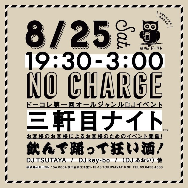 三軒茶屋駅より徒歩5分。今年の4月にオープンしたばかりのレコード酒場、"酒場ぁドーコレ"にて記念すべき第一回目オールジャンルパーティを開催。