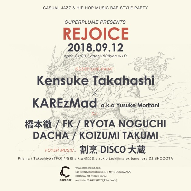 “Rejoice” will be joined by selectors Tohru Hashimoto, Roph Recordings’ label manager Koizumi Takumi (former manager of Nujabes), Hydeout Productions’ flagship shop “Tribe (+Guinness Records)” manager FK who has released from the same label. An evening for true music lovers brought to you by true selectors of Jazz and Hip Hop.