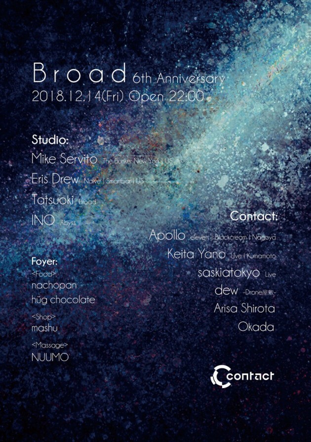 近年、都内のDJコミュニティで着実に評価を築いているTatsuokiの仕掛けるBroadが6周年を迎える。この記念すべき日にふさわしい、ハウス/テクノの才人による見逃せないラインナップが整った。