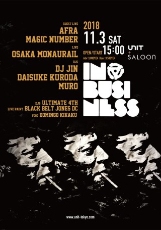そして今回もスペシャルインビジ企画→ ギタリスト竹内朋康が率いる大所帯ファンキー・ジャム・バンド=MAGIC NUMBERがインビジ初登場!“Return Of Rare Groove”を掲げ、名うてのツワモノミュージシャン達を巻き込みながらその名を不動のものとしつつある彼らの参戦に加えて更に、日本を代表、象徴するヒューマンビートボクサー=AFRAがオーサカ=モノレールとの異種格闘セッションに名乗りを挙げる!豪華ゲスト陣とIN BUSINESSクルーが創り出すスーパーポジティヴな「ファンキー音時空間」。土曜の午後の濃密極まりなきサタデーアフタヌーン・セッション。そんな贅沢な瞬間を代官山UNITに集う皆でシェアして欲しい。
