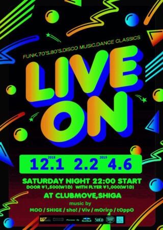 ~LIVE ON~はファンクを中心にソウルやダンスクラシックスなどの70年、80年代のブラックミュージックの土臭く泥臭い本質をさらに追求する内容に!MOVEでお馴染みの出演者 & レギュラー出演者の中でも特にブラックミュージックを愛するメンバー達が集結。メンバーが自信を持って「踊れる選曲」をPLAY!!ファンキー & レアなグルーブはフロアーに至福の時間をもたらします!