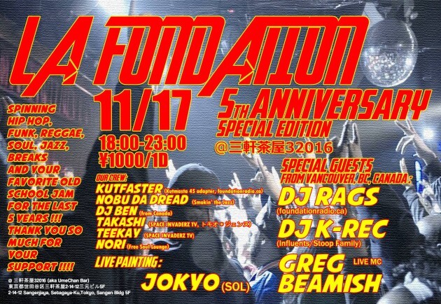 It's been already five years since we started that event called LA FONDATION. It's still an amazing experience and a hell lot of fun. Come join us to celebrate our five anniversary with our crew, awesome guests coming straight from Vancouver, BC, Canada for the event : DJ RAGS, DJ K-REC, Greg Beamish as a live MC and live painter JOKYO (for the first time). Let's put the table for an other year of craziness !!!