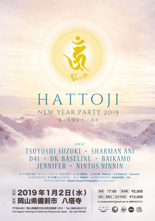 東京、大阪、アムステルダムから、各シーンで活躍するアーティスト達が大集結。食事と宿泊も可能な豪華な New Year Party を、奈良時代、聖武天皇の勅願により道鏡が創建した「八塔寺」にて17時より公演開始。