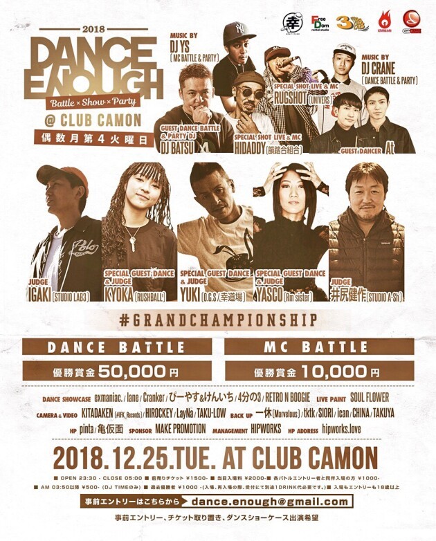 【DANCE ENOUGH 2018】12/25(火)☆DANCE ENOUGH GRAND CHAMPIONSHIP 2018★★DANCE BATTLE & MC BATTLEエントリー随時募集中!!!!