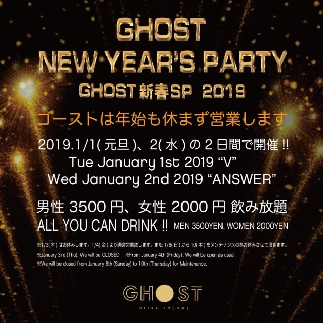 1st (New Year's Day) ALL YOU CAN DRINK !! (10PM - 5AM)