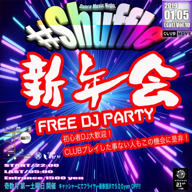 今回のシャッフルは新年会コラボ!CLUB MOVEのレギュラーDJ +初心者DJ大歓迎のFREE DJ PARTY!