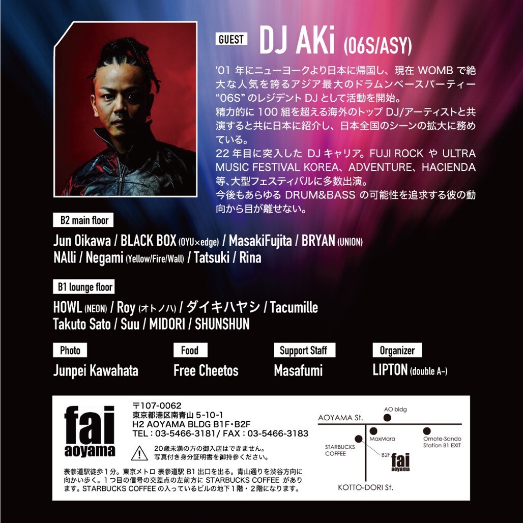 DJ AKi (06S/ASY) '01年にニューヨーク より日本に帰国し、現在WOMBで絶大な人気を誇るアジア最大のドラムンベースパーティー“06S”のレジデントDJとして活動を開始。精力的に15年に渡って100組を超える海外のトップDJ/アーティストと共演し、日本全国のシーンの拡大に務めている。 20年目に突入したDJキャリア。FUJI ROCKや、ULTRA MUSIC FESTIVAL KOREA、ULTRA MUSIC FESTIVAL JAPAN、WOMB ADVENTURE、HACIENDA、Re:animation等、大型フェスティバルに多数出演。海外での活動も活発で、イギ...