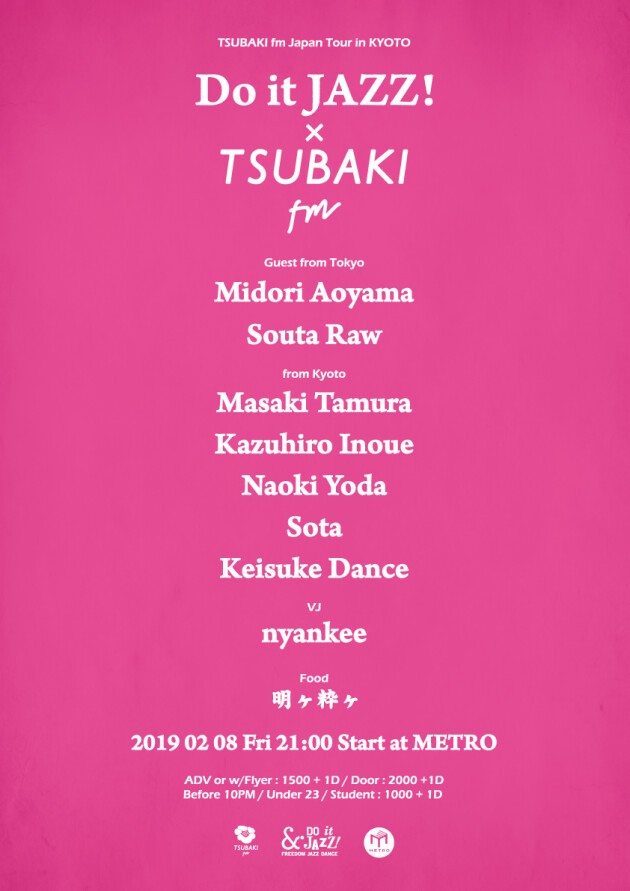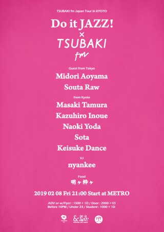 2006 年 に始動以降COLLAGEそしてMETROへと場所を 変え、クラブ以外でも屋上のルーフトップやカフェ・バー、ラウンジ、ショップレセプション、 国際写真展とのコラボレーション等活動を広げ、日本、世界の著名DJを招待し、京都のJAZZ/CROSSOVERミュージックを発信し続けてきた、"DoitJAZZ!"、今回は東京発、インディペンデントミュージックを発信する新しい音楽プラットフォーム『TSUBAKI FM』とコラボレーション。 TSUBAKI FM 仕掛け人であり東京Contactで開催されている人気ハウス・ミュージックパーティ 「Eureka!」 を率いる "Midori Aoyama"。そして良質な音楽を発信し続け音好きに定評のある ”AoyamaTunnel”にてレギュラーとして活躍、玄人をうならせる選曲の ”Souta Raw”が登場。迎え撃つは京都同世代の職人的DJsとDoitJAZZ!レギュラーDJs。Jazz,Soul,Funk,DIsco,Boogieから最新のHouse / Crossoverまで良質な音楽空間をお届けいたします。